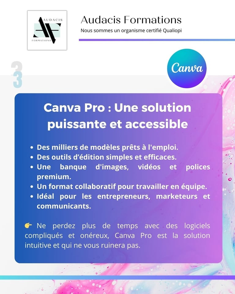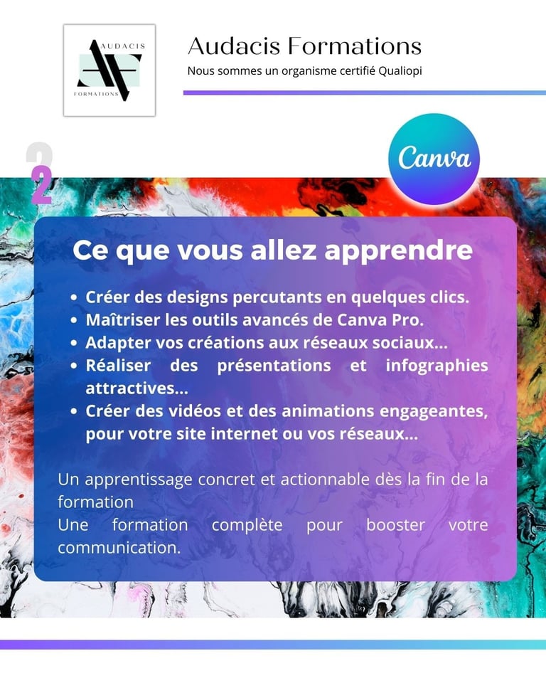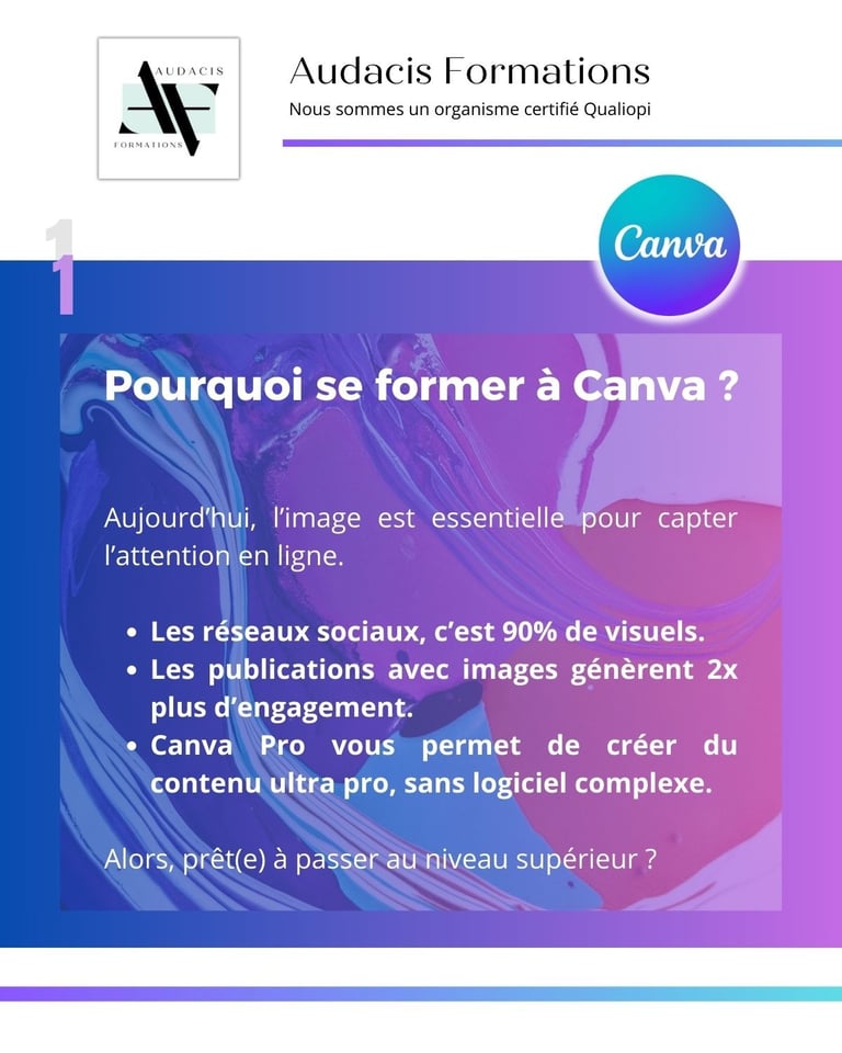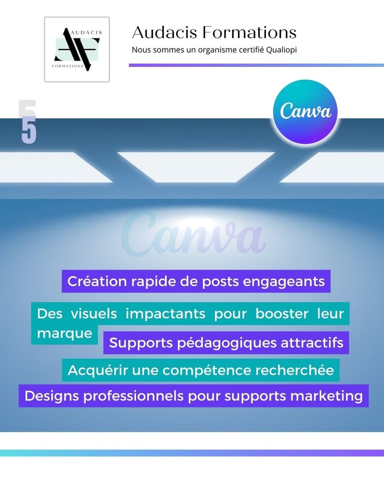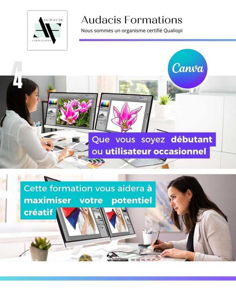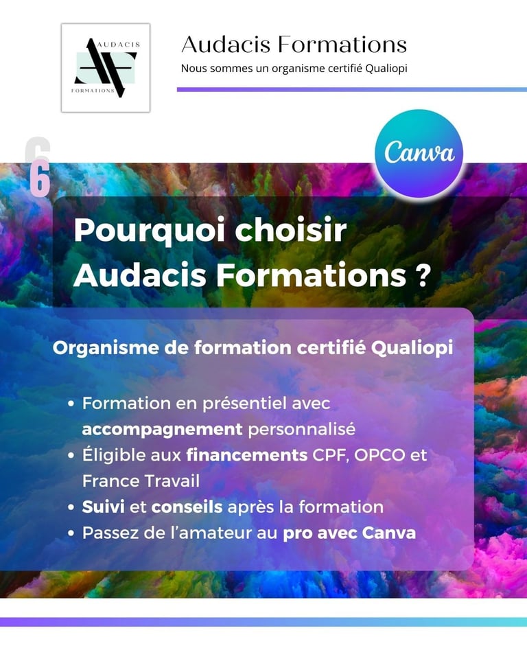 Que vous soyez entrepreneur, community manager, chargé de communication ou formateur, notre formation complète Canva Pro en présentiel vous permet de maîtriser les outils avancés de design graphique et d’optimiser votre communication visuelle, (plus d'infirmations sur les modalités de formation).
